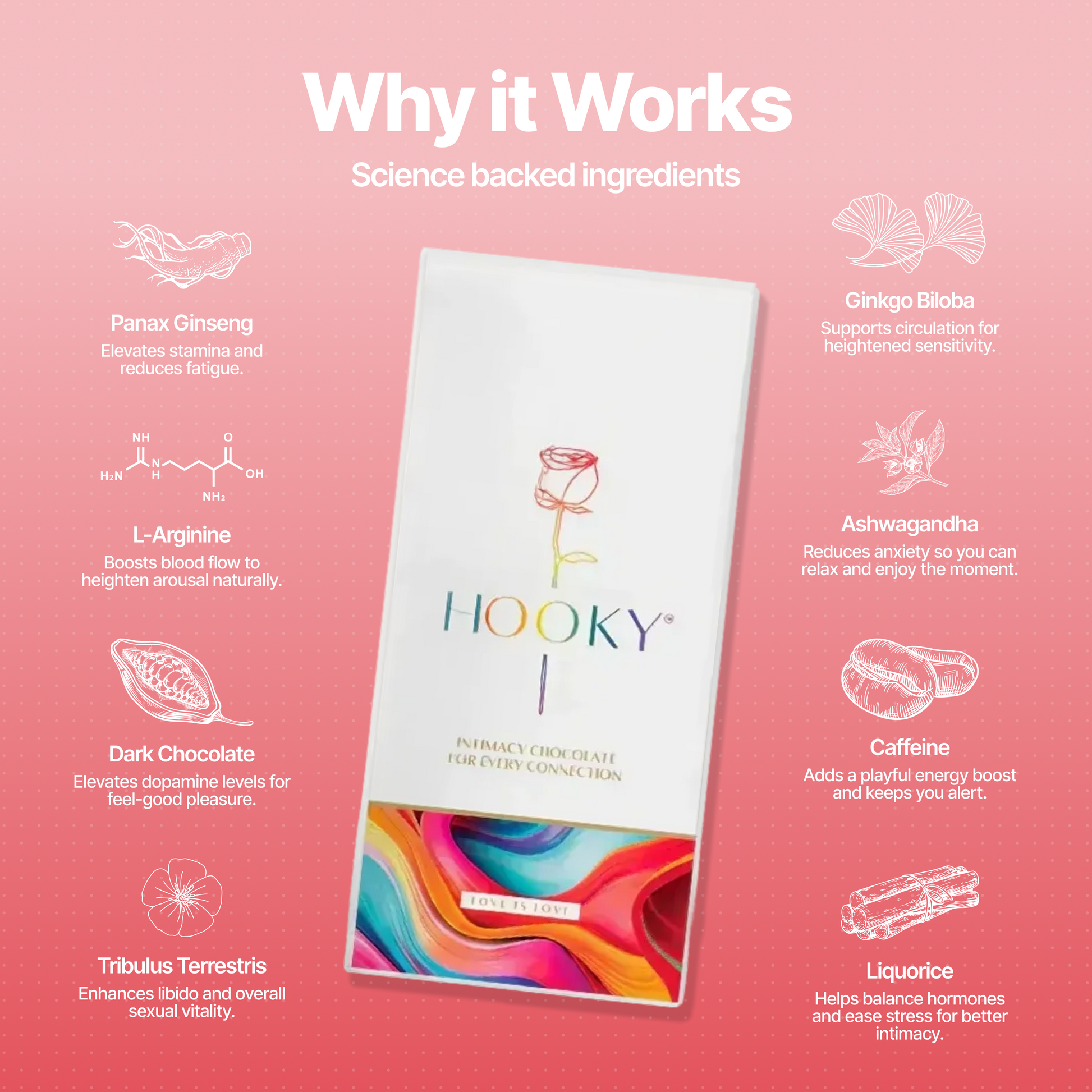 This is premium dark chocolate infused with natural, mood-boosting botanicals that promote energy, connection, and emotional warmth: