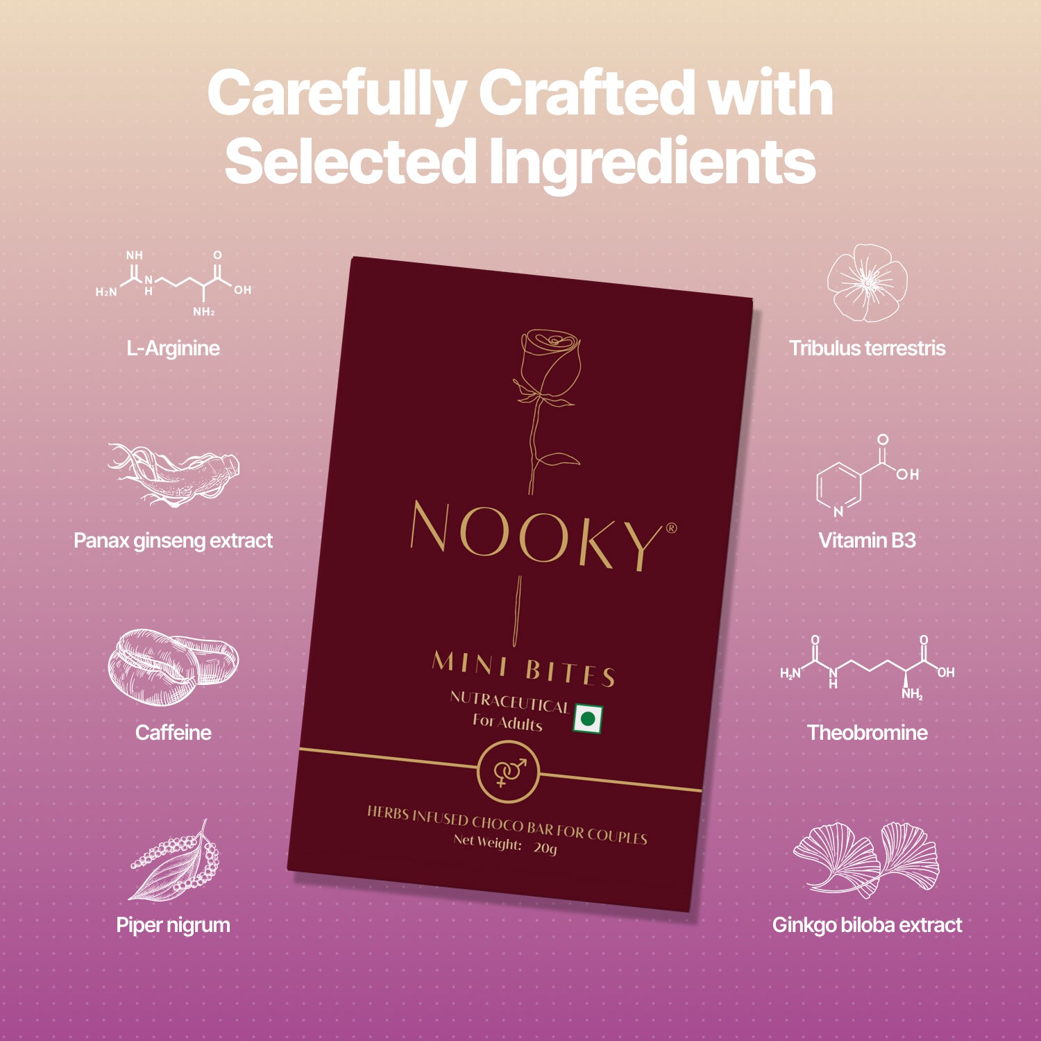 Nooky Mini Bites — two rich, indulgent couple chocolates — are crafted to warm the senses, ease the mind and gently spark desire between partners. Their smooth, luxurious flavour creates a relaxed, inviting atmosphere, making them the perfect beginning to a romantic and intimate moment.
