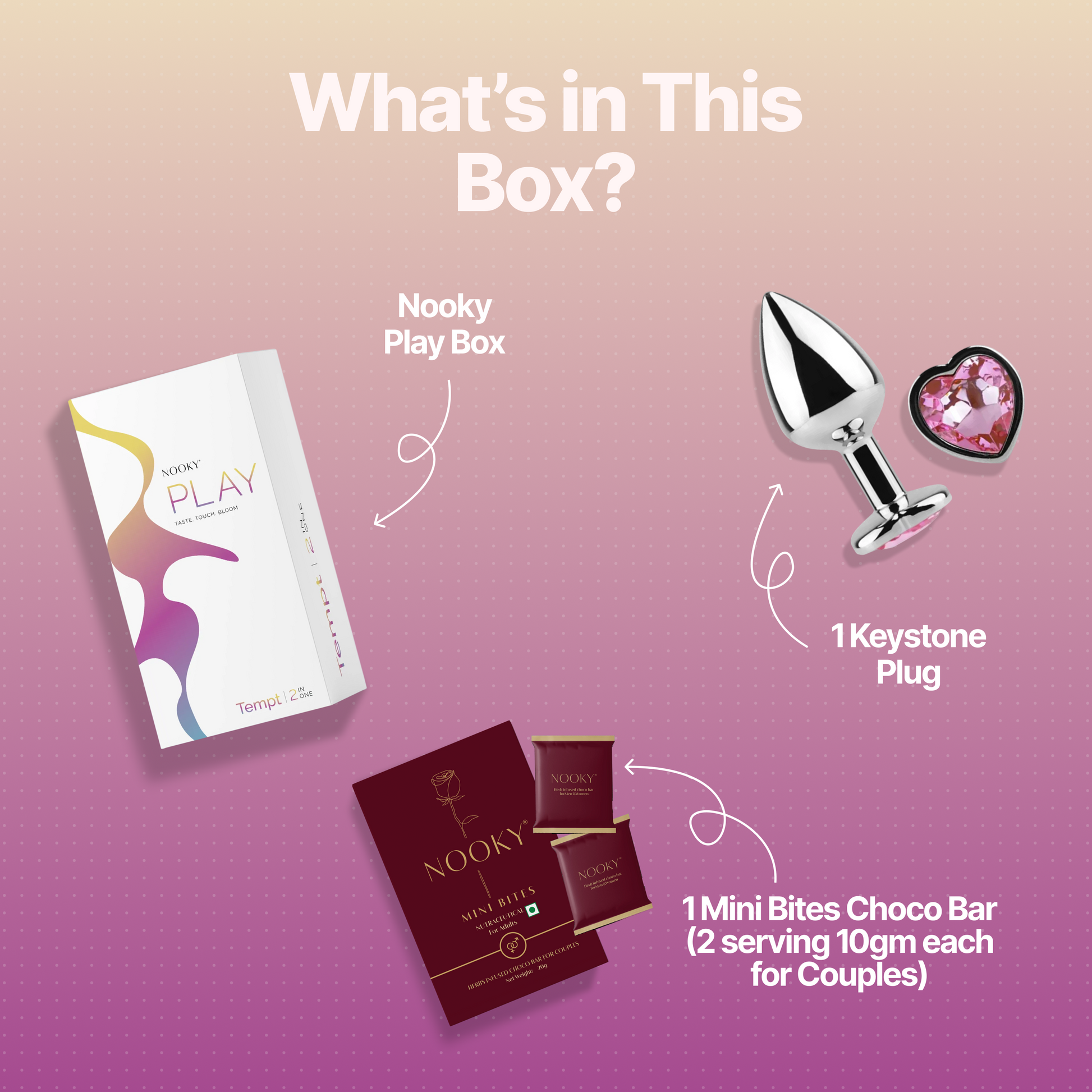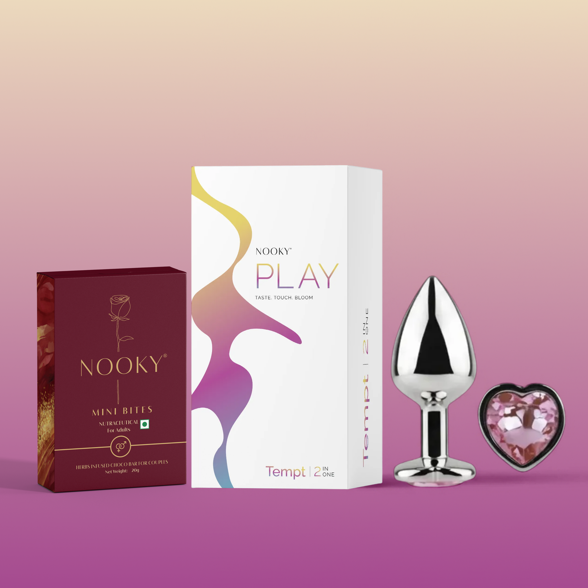 Introducing Nooky Tempt, the perfect combo crafted to bring couples closer through indulgence, exploration and sensual discovery. This curated duo blends the sweetness of Nooky Mini Bites with the exciting touch of the Silver Keystone Butt Plug — creating an experience that is both playful and deeply intimate.