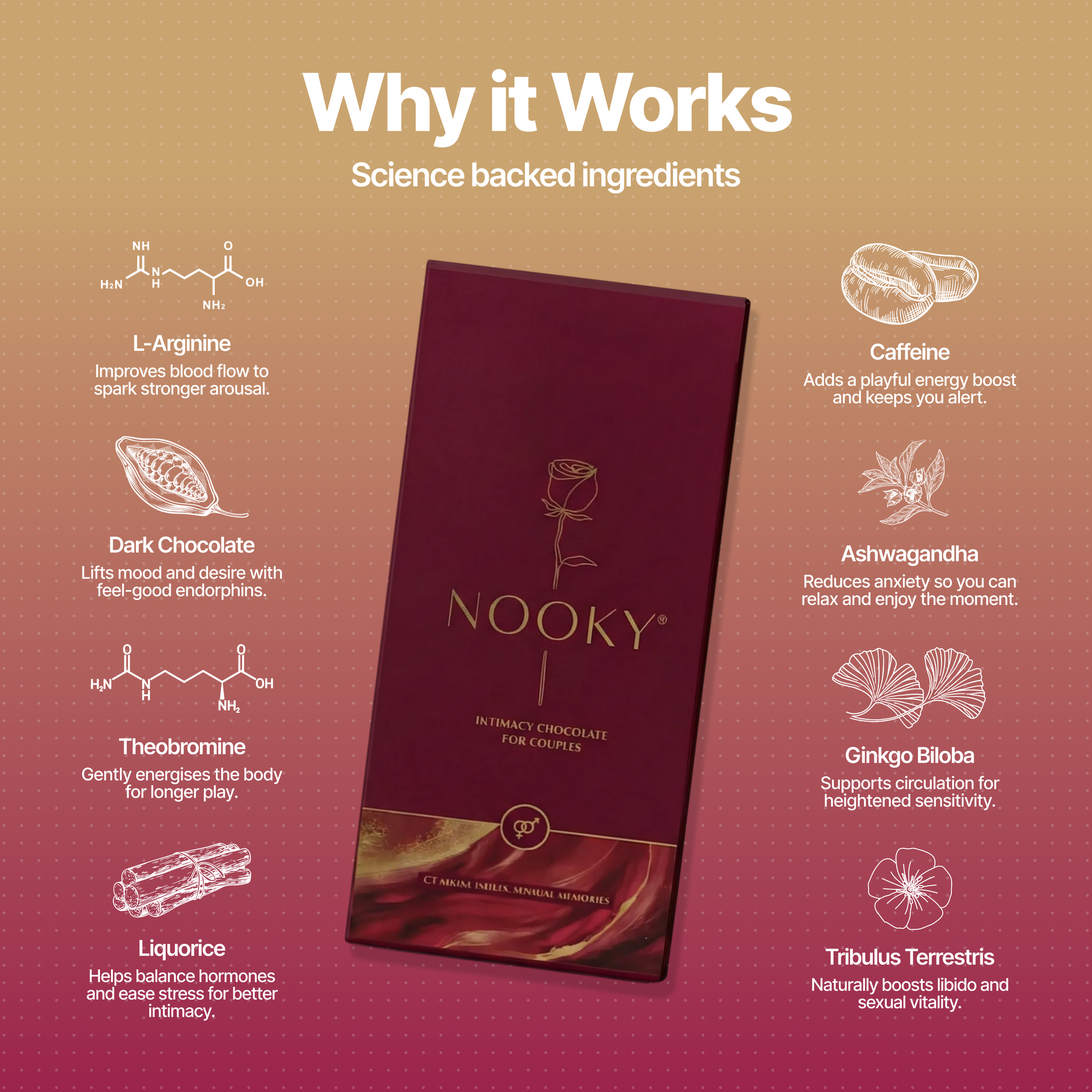 Indulge in Nooky Mood Enhancing Chocolate for Men & Women—a decadent dark chocolate bar infused with natural mood-boosting and energy-enhancing botanicals. Crafted to elevate connection, spark desire, and put you both in the perfect mood for romance.
